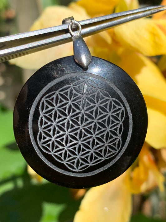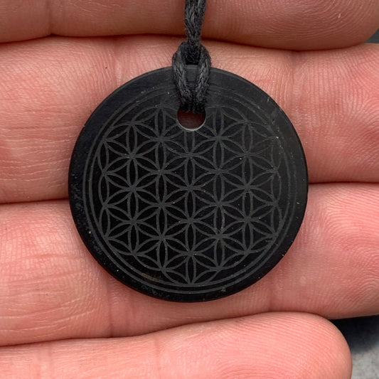 Shungite, pendentif 'Fleur de vie', de 30mm de hauteur x 30 de largeur x 4 d'épaisseur. Vendu avec cordon réglable de couleur noire offert !