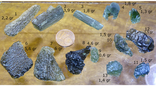 Sélection de Moldavite authentique, de 0,6 à 6 grammes. Le must en matière de pierre de la famille des météorites et tectites. Fascinant, envoutant, hypnotisant !