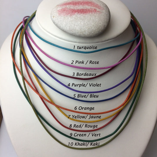 Cordon en fil de cuir de 1,5 mm de diamètre. 43 cm avec rajout de 5cm en chainette métallique, diverses couleurs au choix, bonne qualité, parfait pour assortir vos pendentifs préférés !