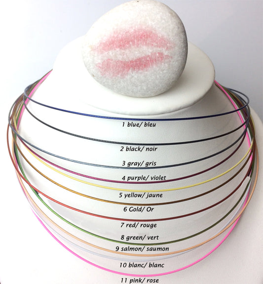 Tour de cou rigide de 1,5 mm de diamètre. 40 centimètres de longueur. Diverses couleurs au choix, bonne qualité, parfait pour assortir vos pendentifs préférés !