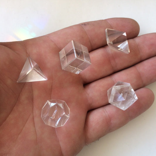 Solides de Platon en cristal de roche. Ø de 1.3 à 1.7 cm - 5 à 7 gr. Vendu avec ou sans coffret et disque de sélénite en option !