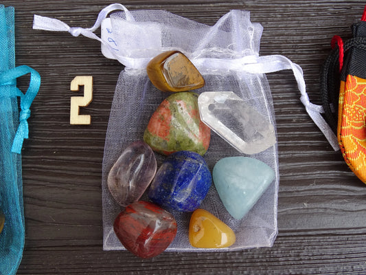 Création Zen Curiosity – Sélection de kits 7 Chakras avec housse. Chaque set est unique, parfait pour débuter en lithothérapie, offrir ou compléter une collection.