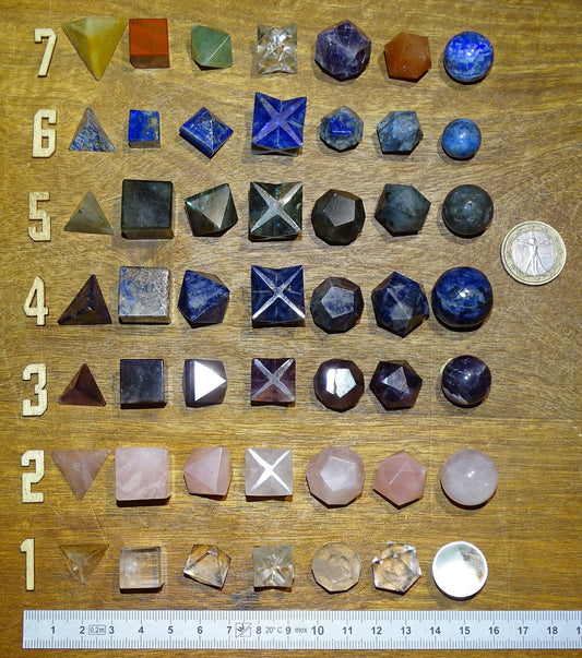 Solides de Platon en lot de 7, type de pierres au choix. Dimensions des pièces : env. 1.3 à 1.7 cm (5 à 7 gr.). Parfait pour l'étude de la géométrie sacré et ses applications !