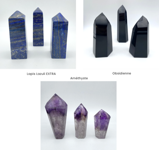 Sélection d'Obélisques au choix en Lapis lazuli, Améthyste ou Obsidienne. 3 tailles au choix : 6/8x3cm - 8/11x4cm - 11/ 14x5cm. Vente à l'unité ou en lot de 3 !... Très belle qualité, parfait ...!