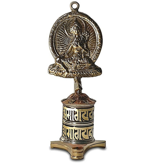 Sélection de Moulin de prières de table authentique fait au Népal de 18 centimètres avec Tara Verte. Très belle qualité, de magnifiques petites oeuvres d'Arts !