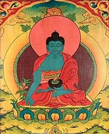 Thangka (panneau en bois sacré) du Bouddha 'medecin', de 66 x 52 centimètres, incroyable conception dans un cadre en bois de pin, soigneusement peints à la main dans de belles couleurs chatoyantes !