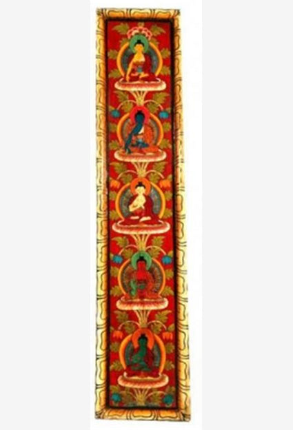 Thangka/ panneau en bois de 91 x 20 centimètres, incroyable conception dans un cadre en bois de pin, avec les 5 Bouddhas !