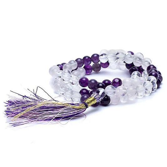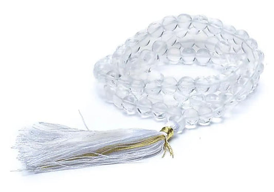 Mala en Cristal de roche/ quartz - 108 perles de 6 ou 8 mm(au choix) - Taille de 65 à 85 cm. Pochette de rangement incluse !