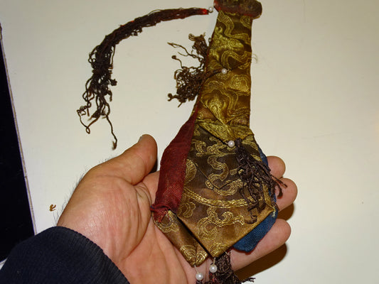 Damaru Tibétain ou 'tambour de mendiant'. Issu de rituels mystiques, joliment décoré de pampilles et de franges colorées, avec housse en brocart de soie !