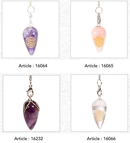 Sélection de pendules en pierre avec gravure de la fleur de vie ou Lotus, modèles au choix. Pour radiesthésie, pour professionnel ou débutant, parfait !