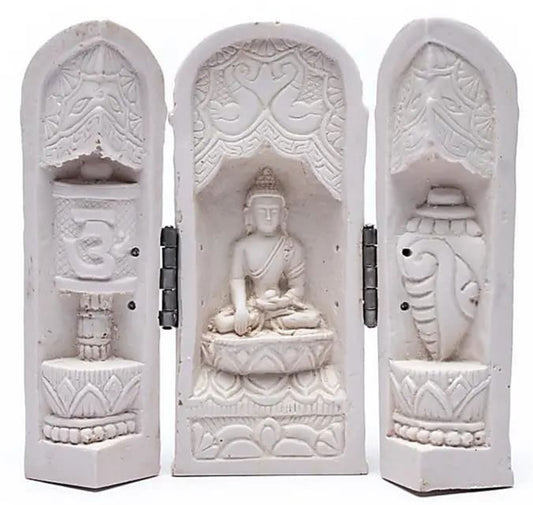 Bouddha Shakyamuni en triptyque avec une conque et une roue de prière, symbolisant la sagesse et la méthode, les deux «ailes» nécessaires pour voler vers l'illumination.