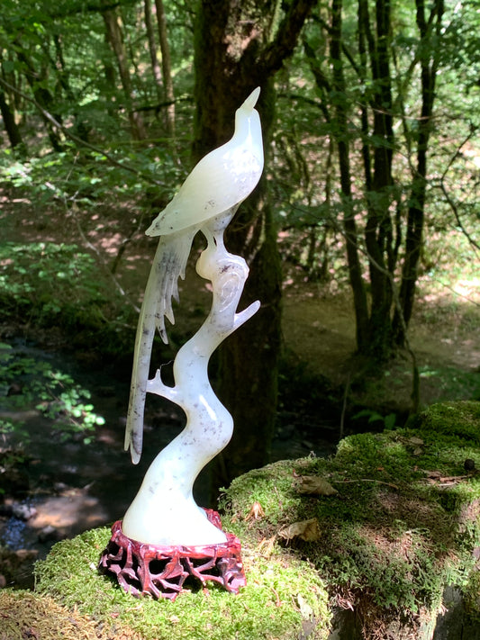 Jadéite sculpture de Paon/ Faisan sur tronc (玉雕). Sculpté à la main et base en bois ajouré. 28 cm de haut x 8 x 6,5. Période 20ème siécle, objet d'art rare, superbe et précieux !