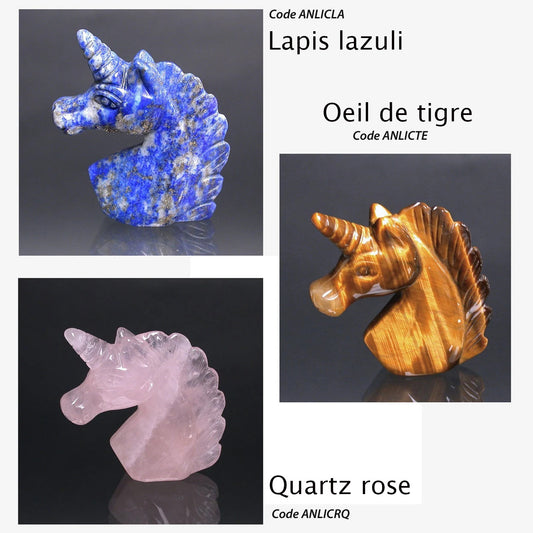 🦄 Sélection de licornes en pierres – Au choix : Lapis-lazuli, Œil de Tigre ou Quartz rose. Dimensions : ±45 × 45 × 15 mm / Poids : ±38 g.