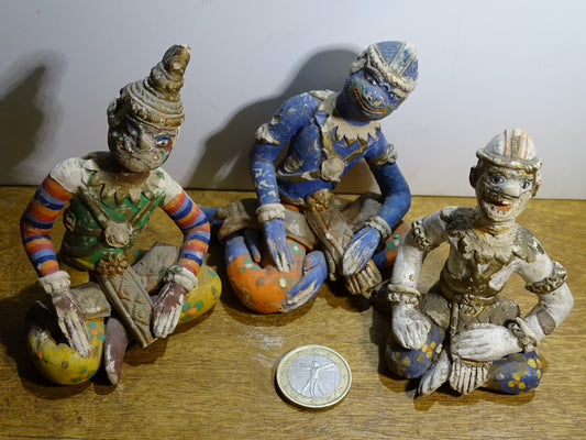 3 mini-statuettes de 7 à 8 cm de haut. Fait et peint à la main, origine inconnue. Magnifique représentation d'homme animaux, superbe !