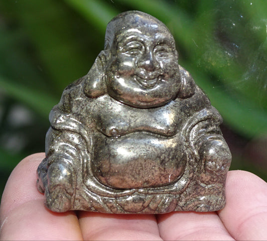 Bouddha Rieur en pyrite, fait main, taille de 50 mm x 45 x 26 - 134 gr. - Très belle petite pièce !