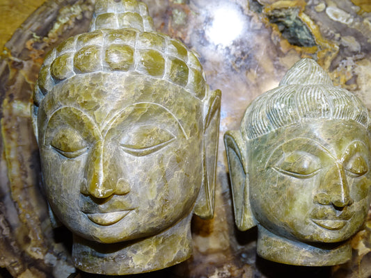 Sélection au choix de 2 Têtes du Bouddha, pièces anciennes, sculptés en pierre de type Jadeite. Taille XL de 8 et 11 cm !