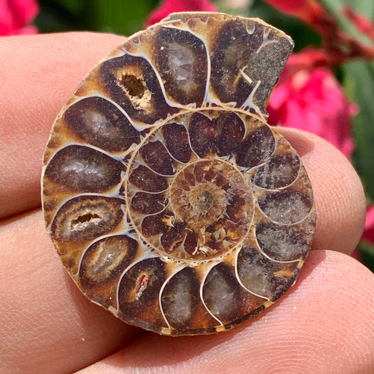 Ammonite nacrée sciée en 2, médaillon de 33mm x 28 x 9 - 9,9 grammes. Parfait pour collection, exposition...