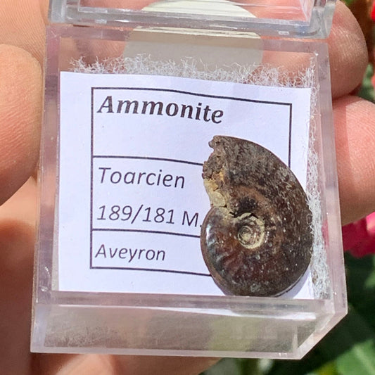 Ammonite pyritisé de France (Aveyron), de 26mm x 20 x 10 - 8,5 grammes. Parfait pour collection, exposition... Vendu avec boîte de 4 x3,3 x2 cm !