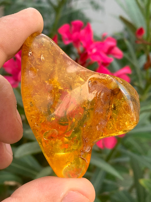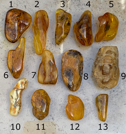 Ambre bleu de Sumatra, sélection de galets polis, couleur 'cerise/ ambre cognac'. Très belle qualité, en transparence vous verrez des reflets rouges ambrés incroyables et un bleu envoutant sous une lampe U.V. !