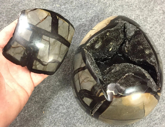 Septaria, oeuf de taille XL en 2 parties, 2,3 kilogrammes, 18x 12 x 12 centimètres. Superbe qualité, incroyables effets positifs pour vos collections, expositions...