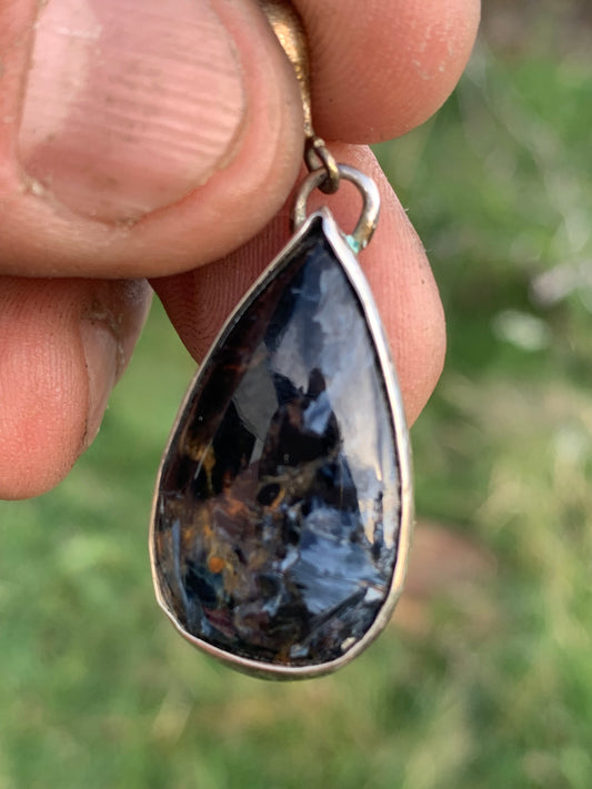 Pietersite, pendentif en Argent 925 de 30mm de hauteur x 15 de largeur x 6 d'épaisseur - 6 grammes. Vendu avec cordon réglable de couleur noire !