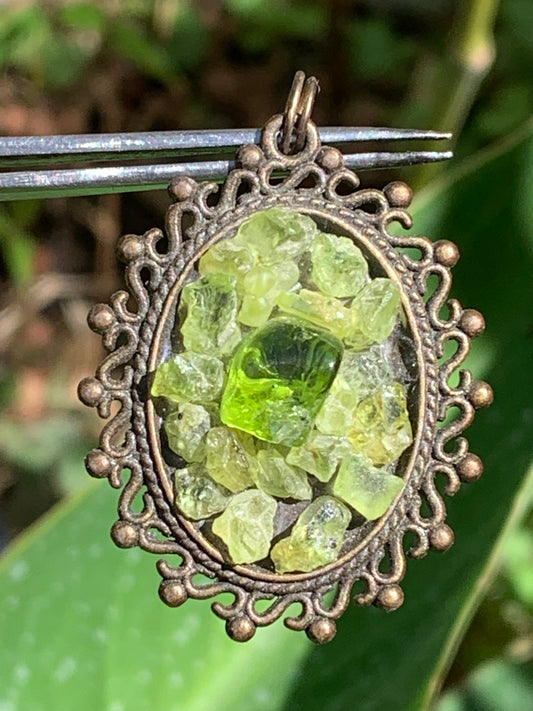 Médaillon couleur Bronze avec Péridot, de 36 mm de ht x30 x 11. Vendu avec un cordon noir réglable !