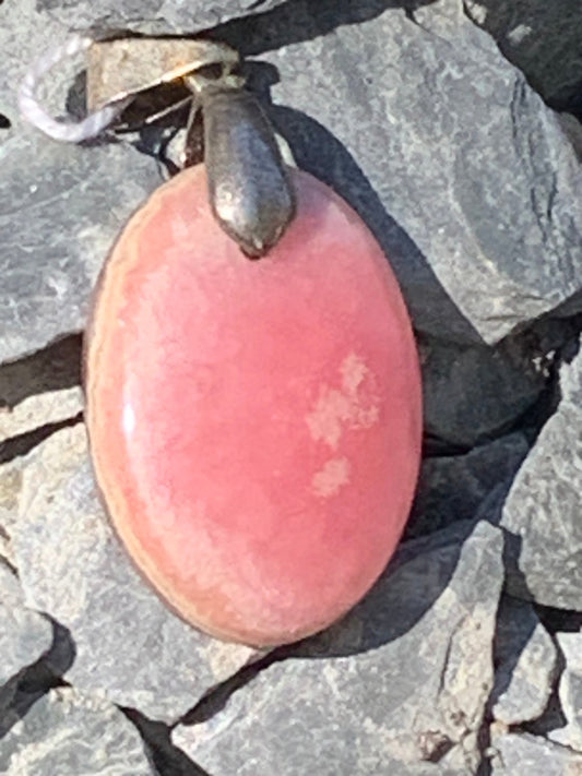 Rhodochrosite, 'cabochon percé' de 37 mm x 17 x 6. Vendu avec un cordon réglable de couleur noire !
