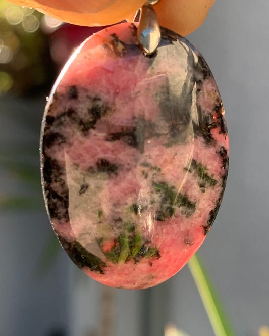 Rhodonite, pendentif 'cabochon percé' de 40 mm x30 x7. Vendu avec cordon réglable de couleur noire !