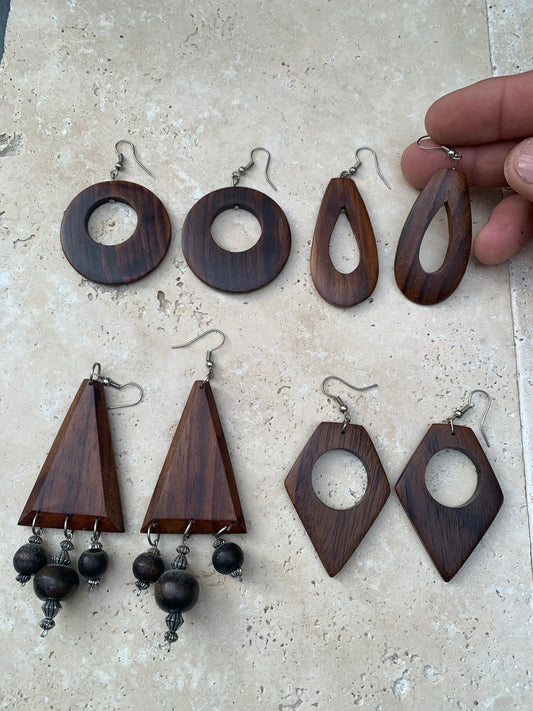 Boucles d'oreilles en bois d'acajou de 6 à 10 centimètres de hauteur, boucle en métal, 2 options : laiton argenté ou Argent 925, superbes pièces !