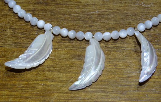 Nacre, collier de 42 centimètres avec plumes. Perles rondes de 6 millimètres, montées sur fil d'acier de haute résistance, fait par Gem & Zen !