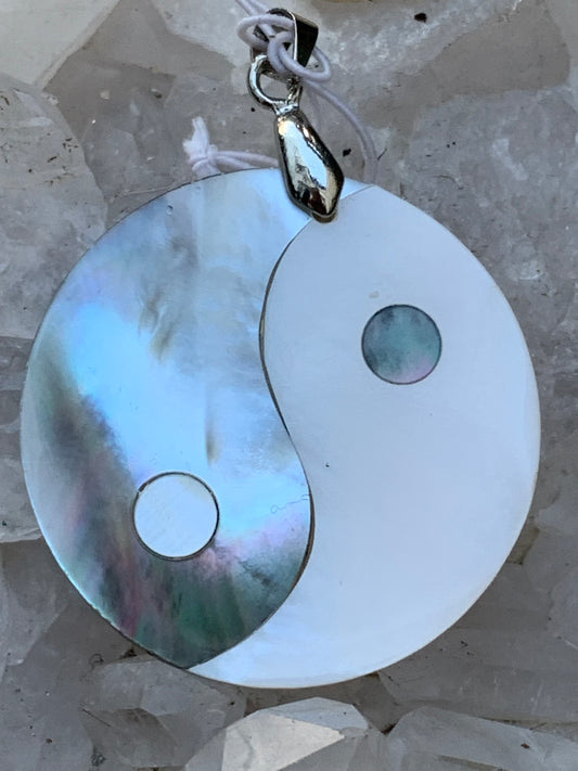 Yin-Yang, pendentif en véritable nacre de coquillage, de 3.2 centimètres de diamètre, vendu avec cordon noir réglable avec attache en Argent 0.925. Élégance naturelle & symbole d’équilibre !