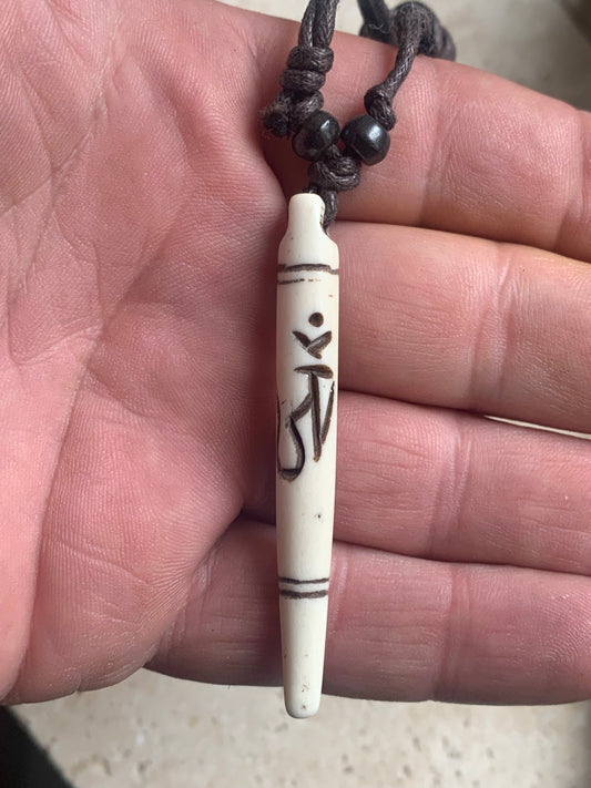 Pendentif élégant artisanal du Népal, sculpté dans de l’os avec le symbole sacré Om, de 60 millimètres de hauteur x 10 de diamètre. Vendu avec cordon noir réglable offert, parfait !
