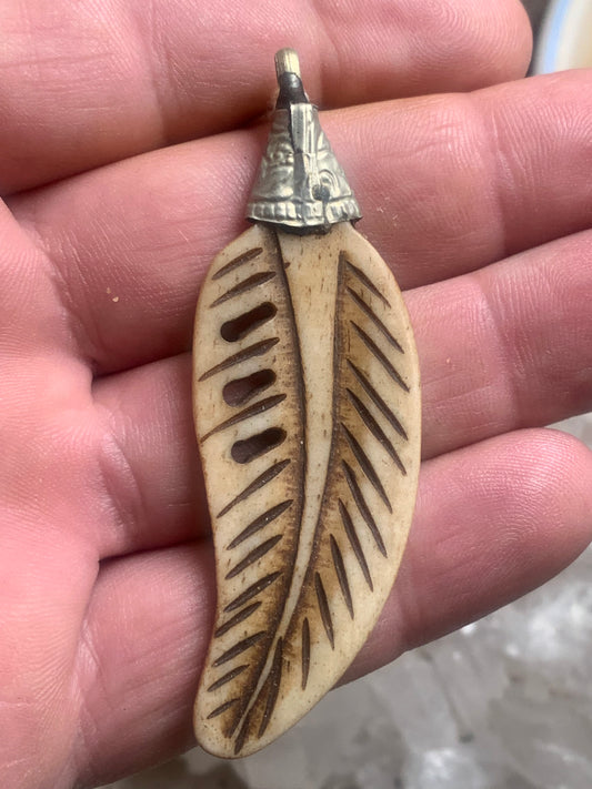 Pendentif artisanal du Népal en forme de plume, sculpté dans de l’os, de 70 millimètres de hauteur x 22 de largeur x 5 d'épaisseur. Vendu avec cordon noir réglable offert, parfait !