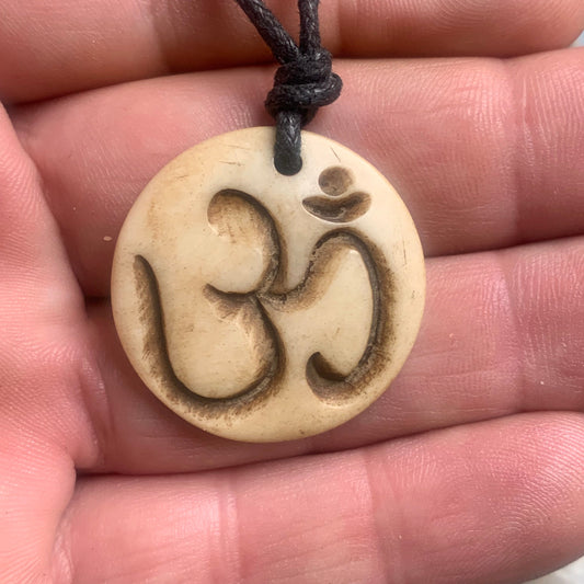 Pendentif artisanal du Népal avec symbole Om, sculpté dans de l’os, de 30 millimètres de diamètre x 4 mm d'épaisseur. Vendu avec cordon noir réglable offert, parfait !
