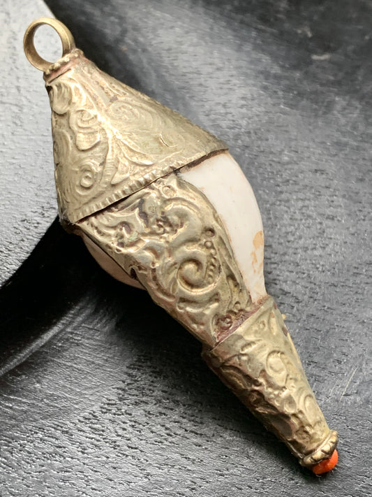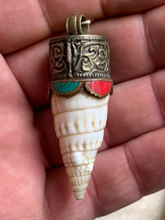 Pendentif artisanal du Népal en coquillage sertis en métal avec de jolies gravures et de la turquoise avec du corail ! De 53 millimètres de hauteur x 18 mm de diamètre. Vendu avec cordon noir réglable offert, parfait !