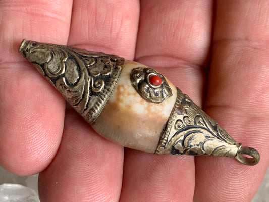 Pendentif artisanal du Népal en coquillage sertis en métal avec de jolies gravures et une perle de corail ! De 65 millimètres de hauteur x 28 mm de diamètre. Vendu avec cordon noir réglable offert, parfait !