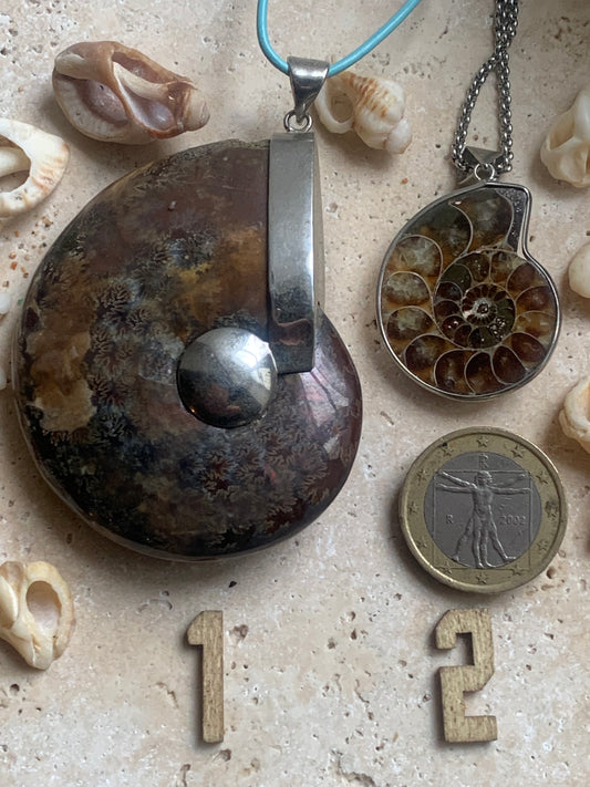 Pendentifs d'Ammonites fossiles, disponibles en 2 tailles, 60x50x20 et 35x25x10 mm. Chaque pièce est authentique et unique, révélant les spirales naturelles et les motifs fascinants de ce fossile. Livrés avec cordon coulissant, prêt à porté ou à offrir !