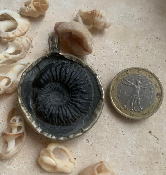 Joli pendentif en fossile d'Ammonite avec une structure de métal (laiton). Environ 3,5 centimètres de diamètre ! Vendu avec ou sans cordon noir et réglable de 60 cm !