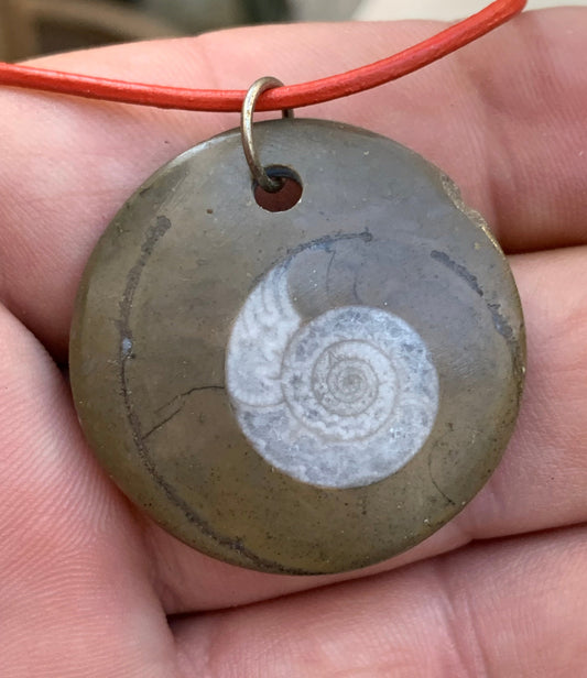 Ammonite fossile dans grès rouge (Usa), pendentif de 33 millimètres x 6. Vendu avec cordon noir et réglable de 60 cm !