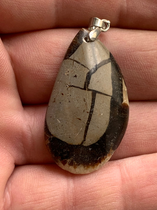 Septaria, « pierre du dragon » ou « pierre de tonnerre », pendentif en cabochon de 48x25x8 millimètres, vendu avec cordon coulissant (réglable), en cuir noir de 40 à 70 centimètres !
