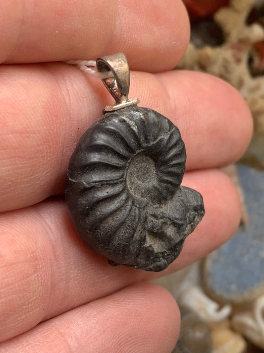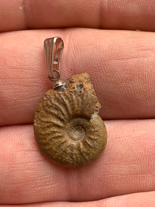 Ammonite fossile du Népal, taille de 45x35x12 millimètres. Pièce authentique et unique, révélant les spirales naturelles et les motifs fascinants de ce fossile. Livré avec cordon coulissant, prêt à porté ou à offrir !