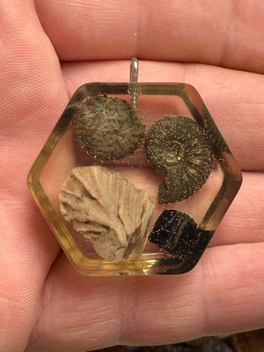 Orgonite avec Ammonite et fossiles, pendentif de taille de 42 millimètres x 44 x 12. Vendu avec ou sans cordon noir et réglable de 60 cm !