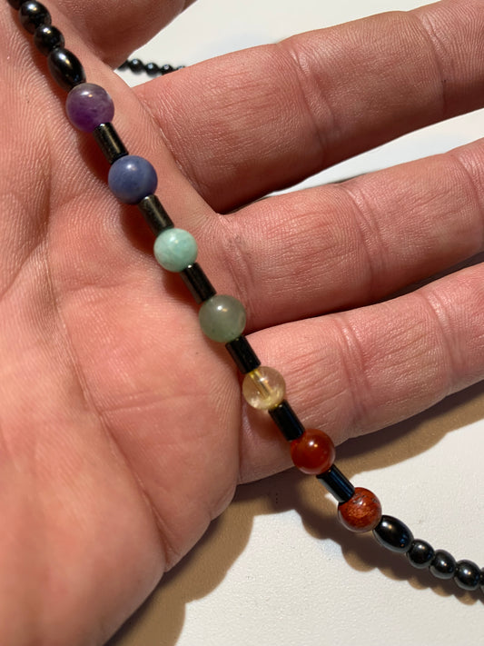 Necklace created by Zen Curiosity â 7 chakras and hematite, round beads 4 to 6 mm â Length 44 cm â 3 finishes to choose from