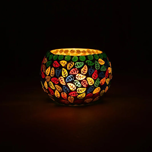 Colored glass mosaic-style candle holder with leaf motifs - Size 9 cm - ± 210 gr. - Sold individually or in pairs!