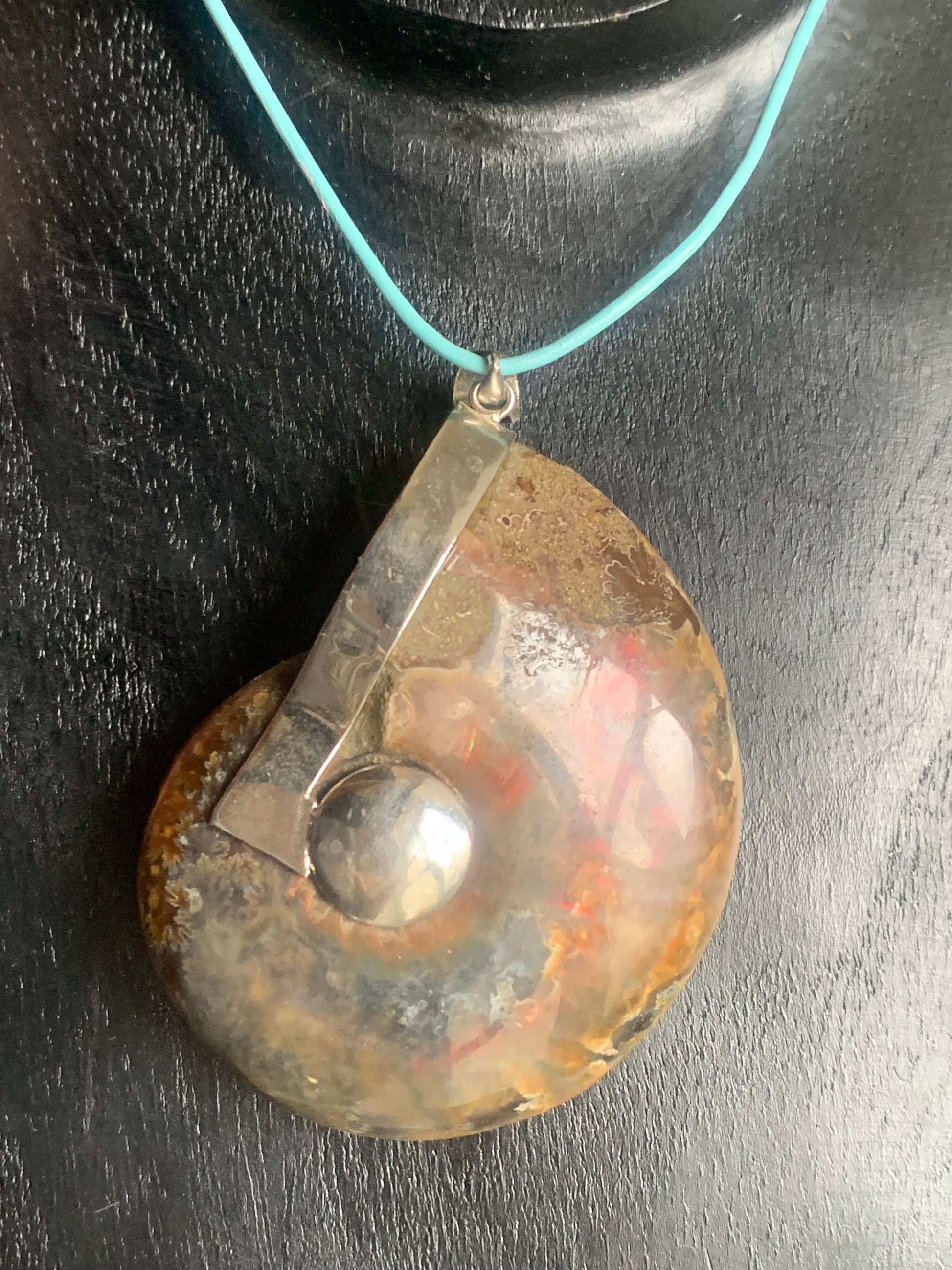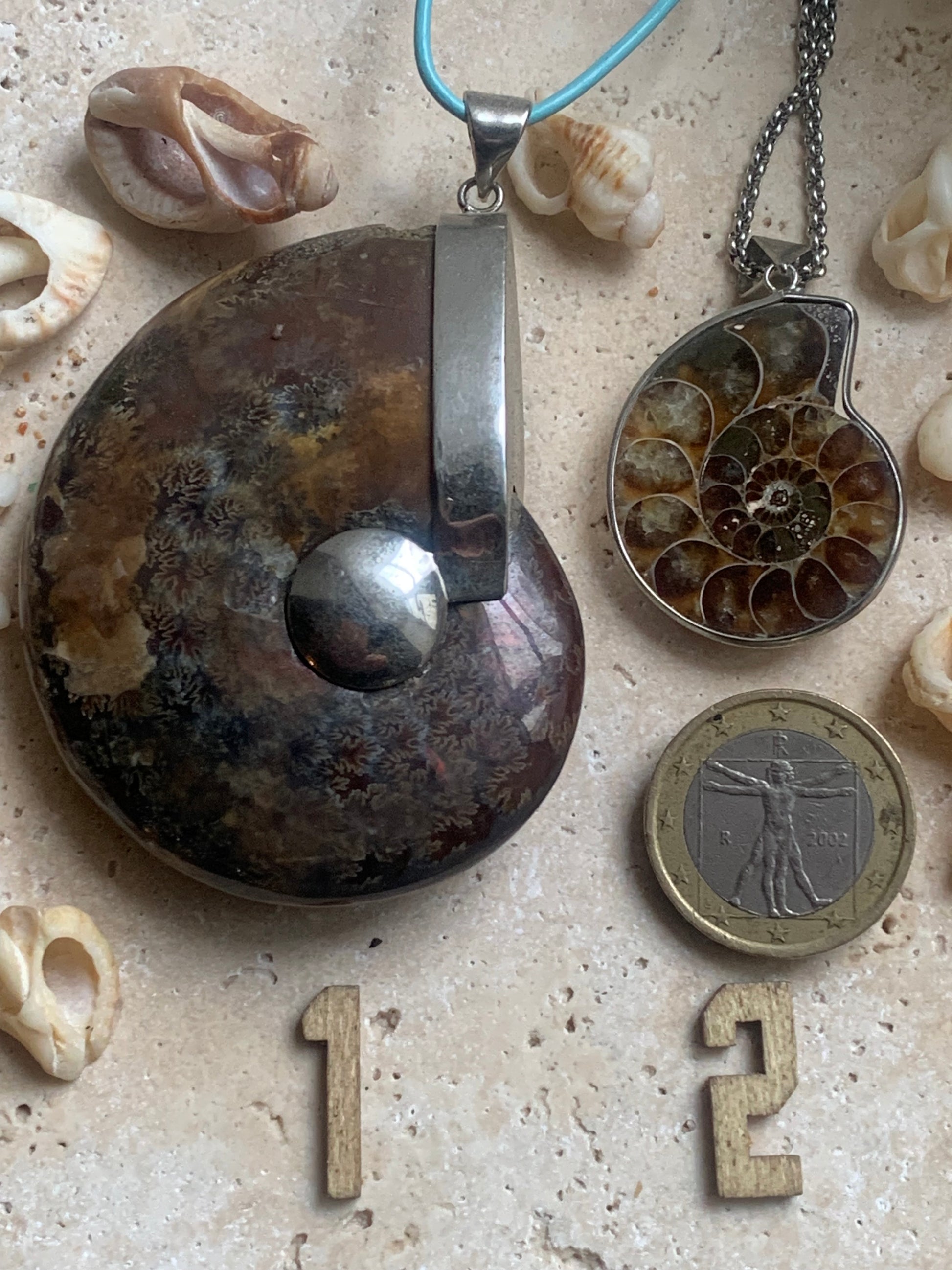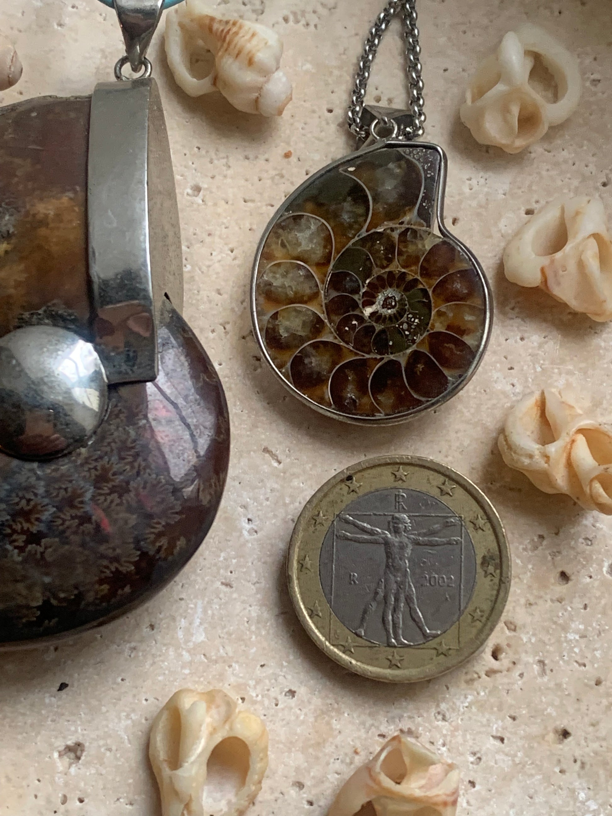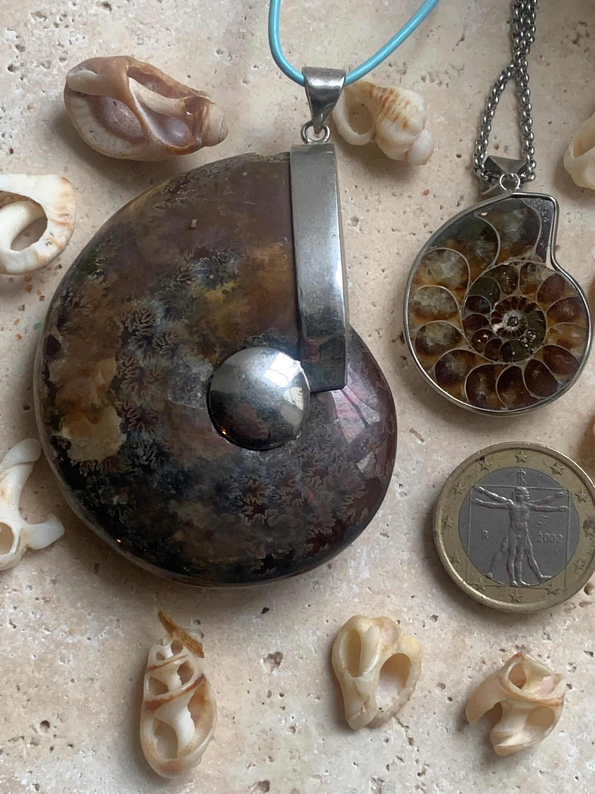 Fossil ammonite pendants, available in two sizes: 60x50x20 and 35x25x10 mm. Each piece is authentic and unique, revealing the natural spirals and fascinating patterns of this fossil. Comes with a drawstring, ready to wear or give as a gift!