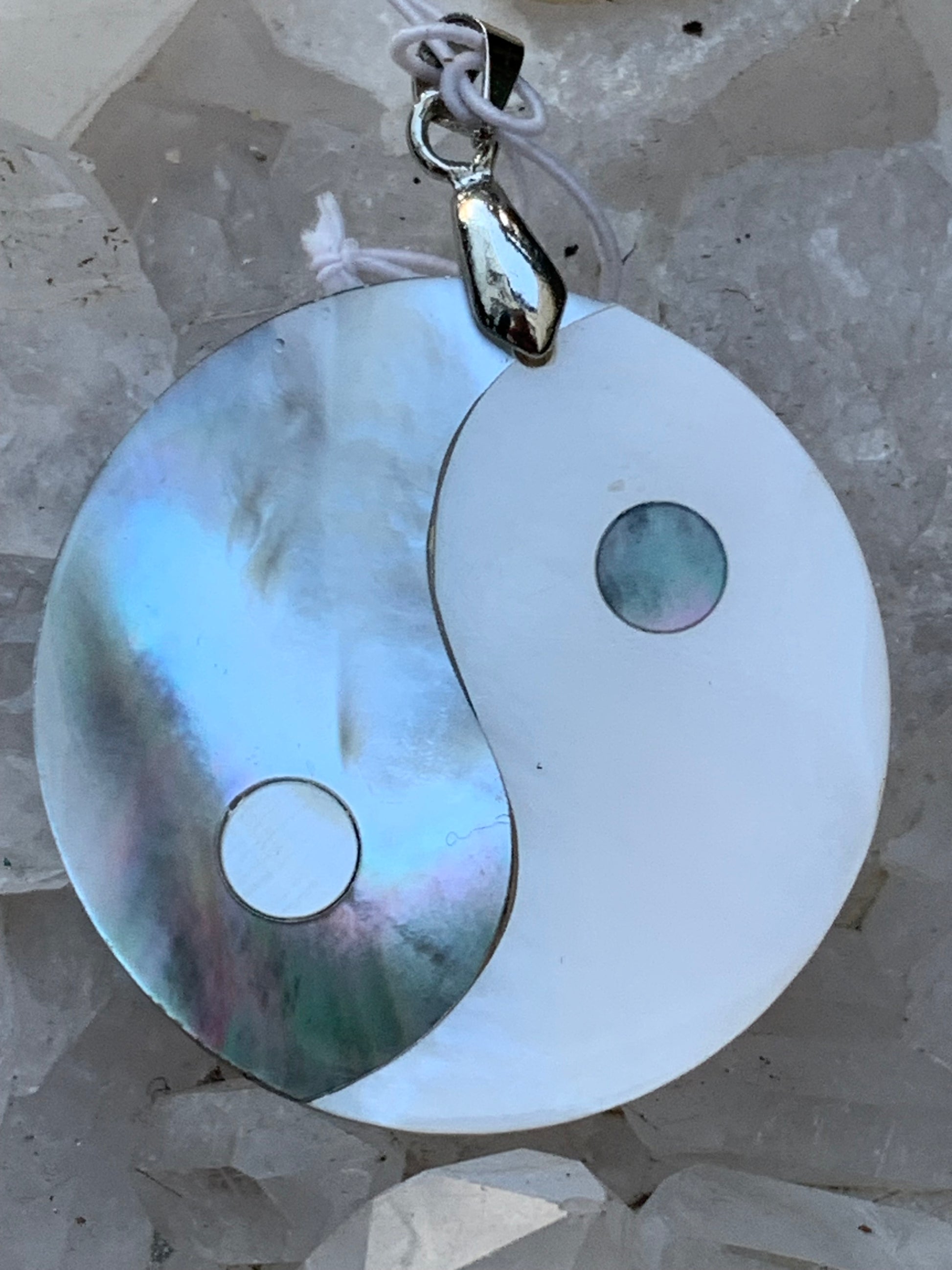 Yin-Yang, pendant in genuine mother-of-pearl shell, 3.2 centimeters in diameter, sold with an adjustable black cord with a 0.925 silver clasp. Natural elegance & a symbol of balance!