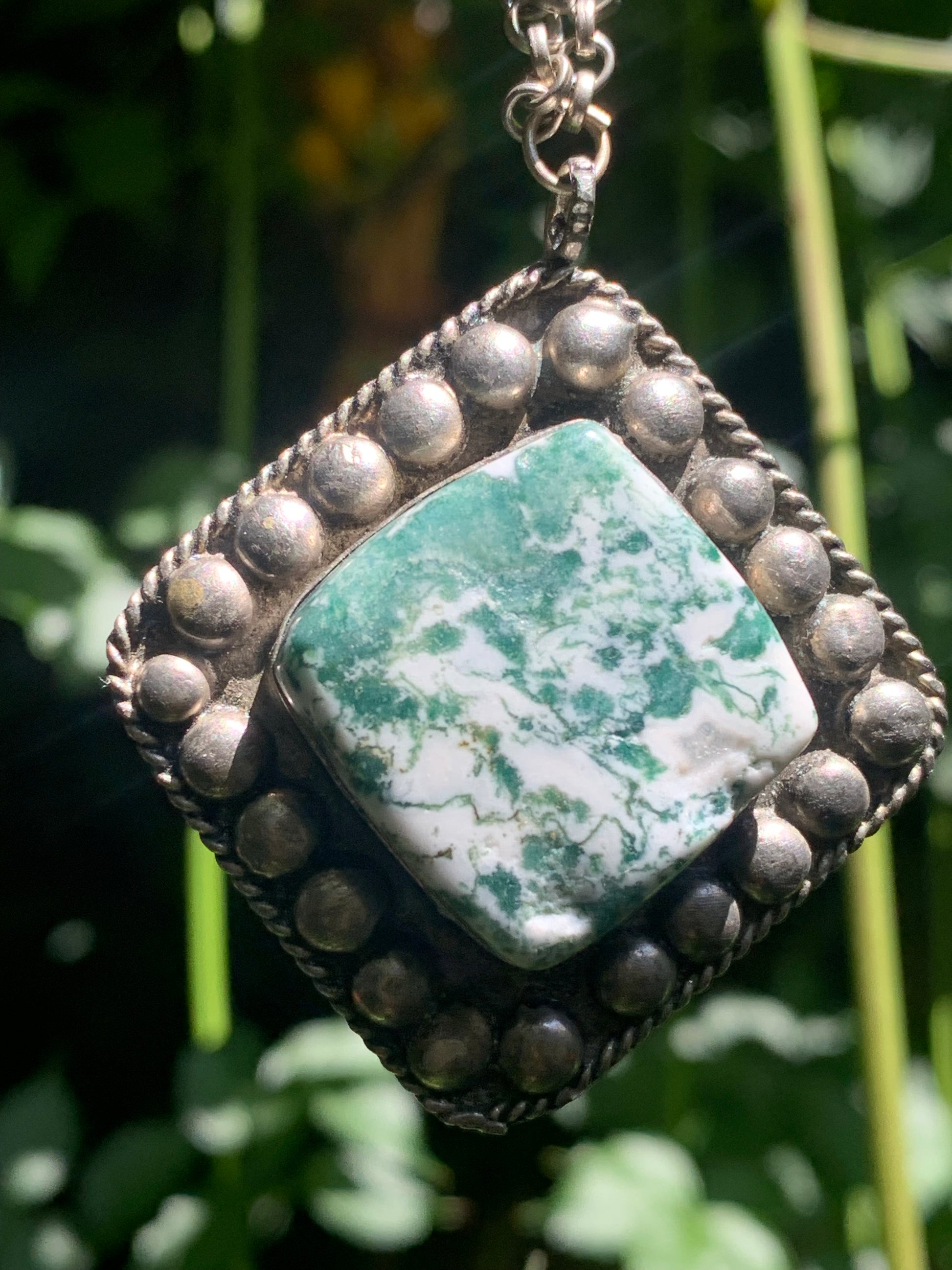 Agate Mousse/ Agate Lichen/ Agate Arbre, pendentif plaqué Argent, de 55mm de hauteur x 45 x 11. Vendu avec chainette de 76 cm !