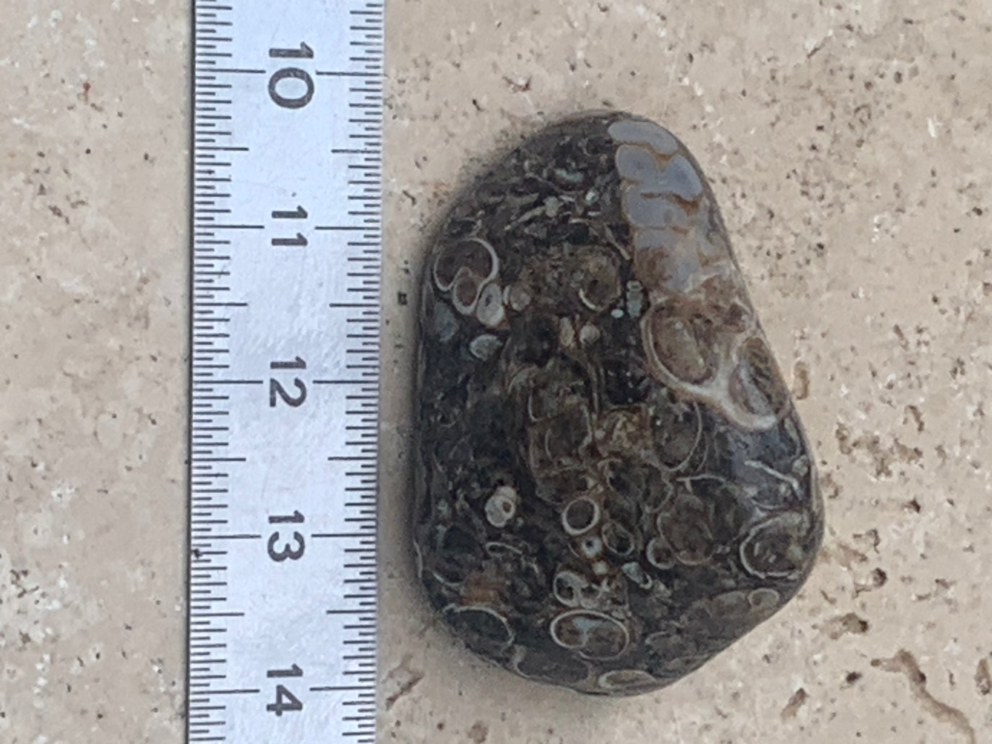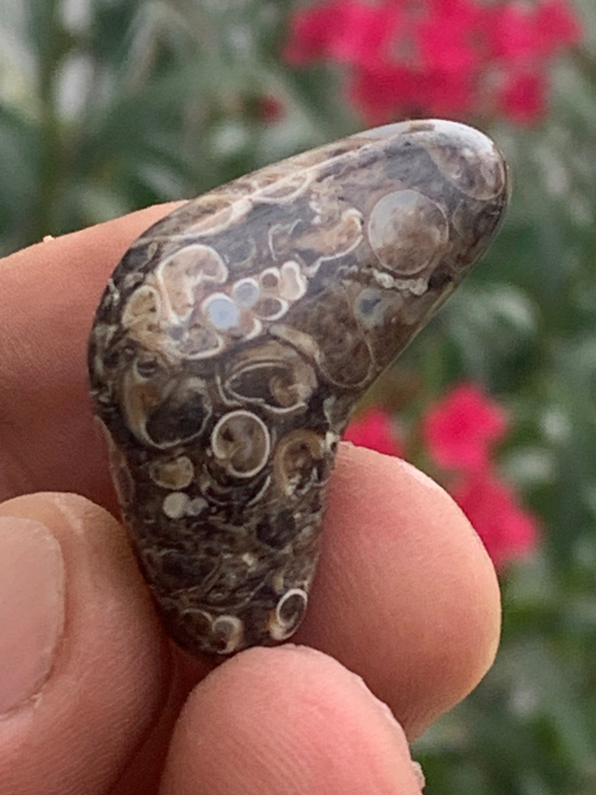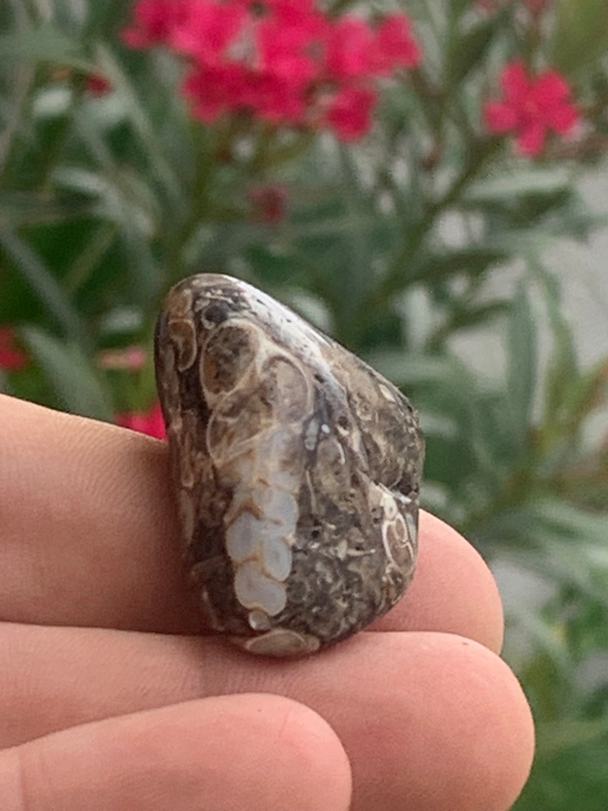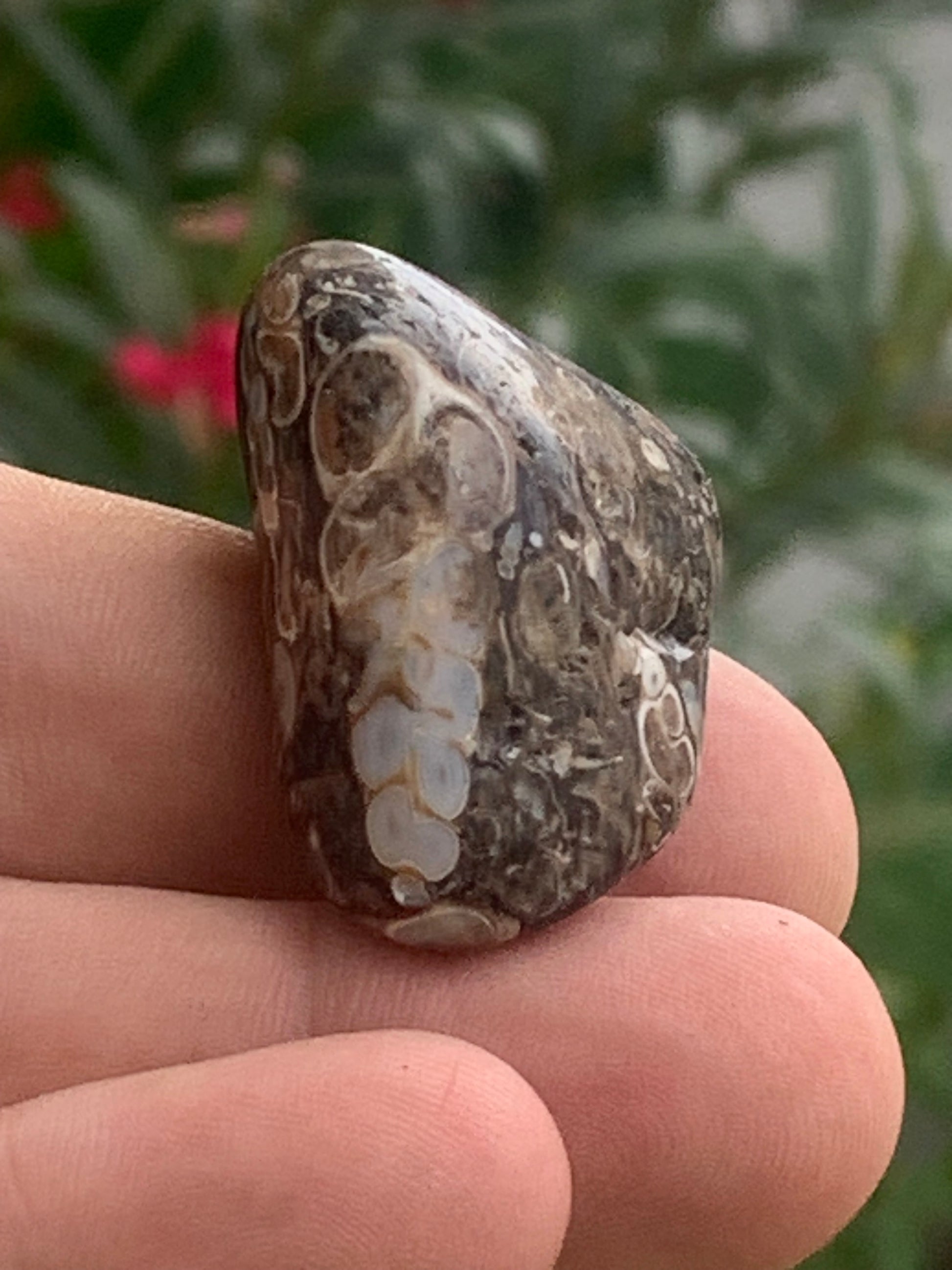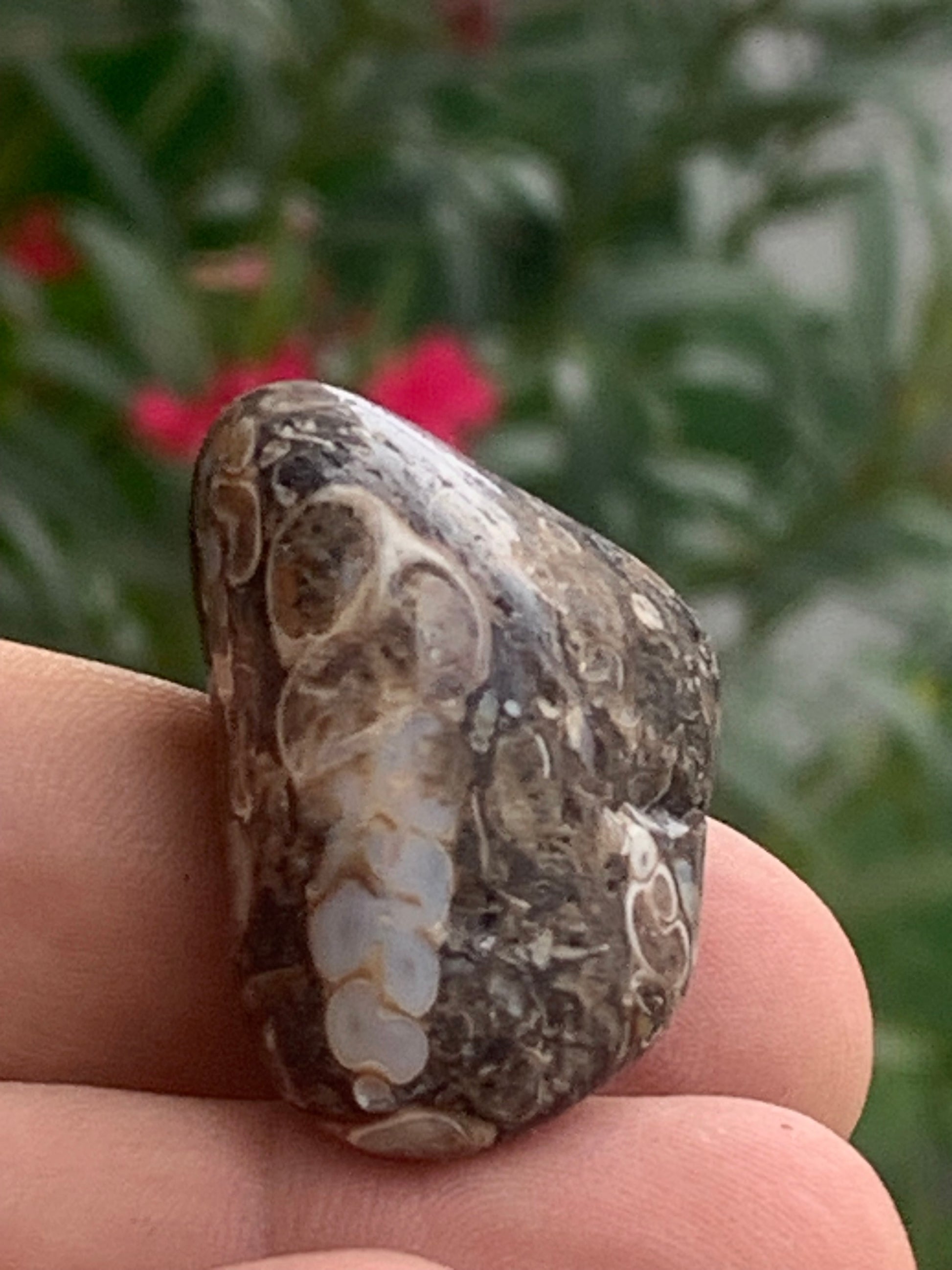 Agate turitelle/ fossile, de 39mm de hauteur x 23 de largeur x 22 d'épaisseur - 20,8 grammes. Magnifique pierre roulée faîte de fossiles !