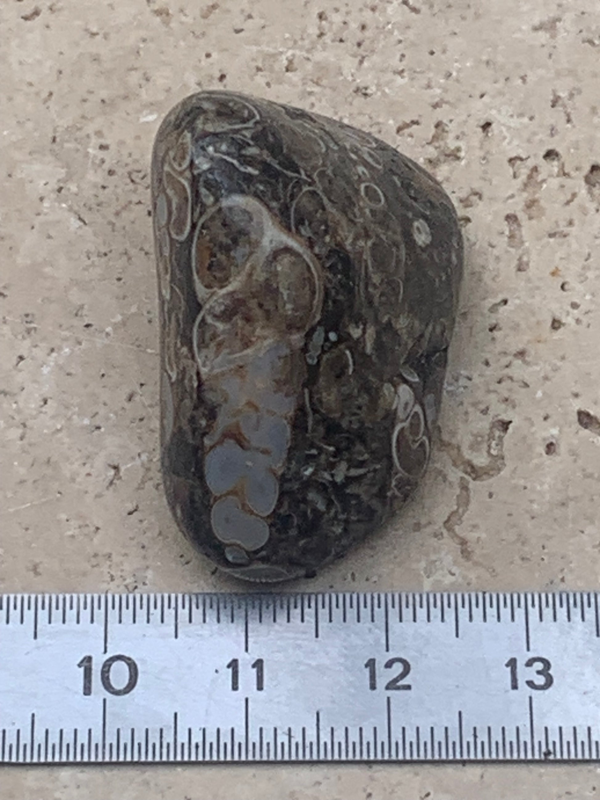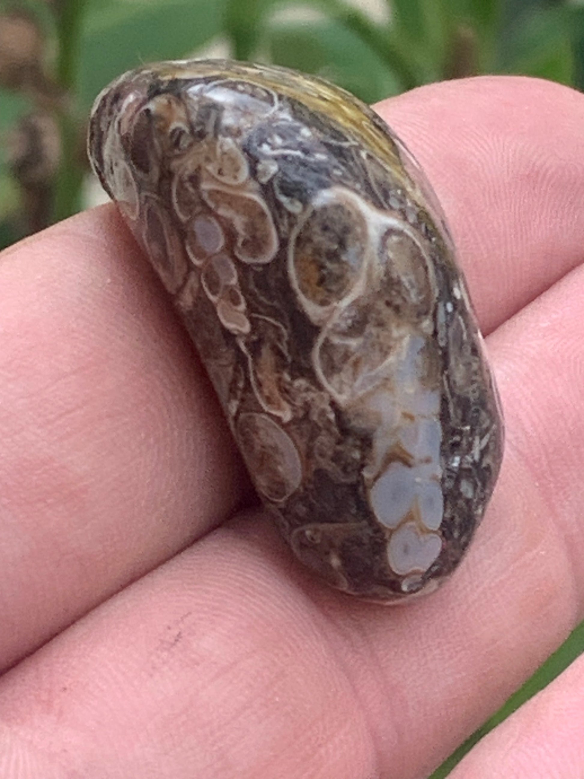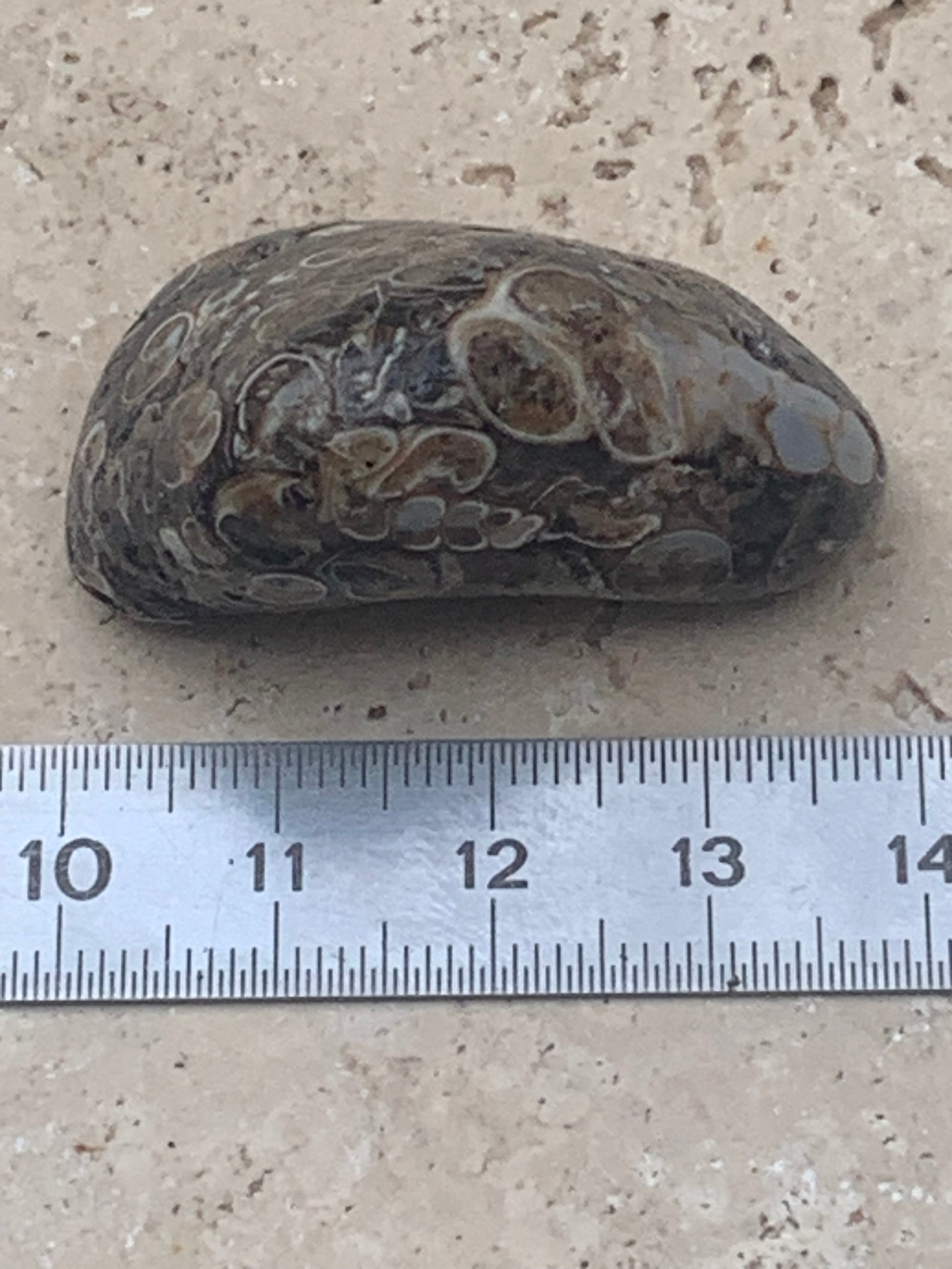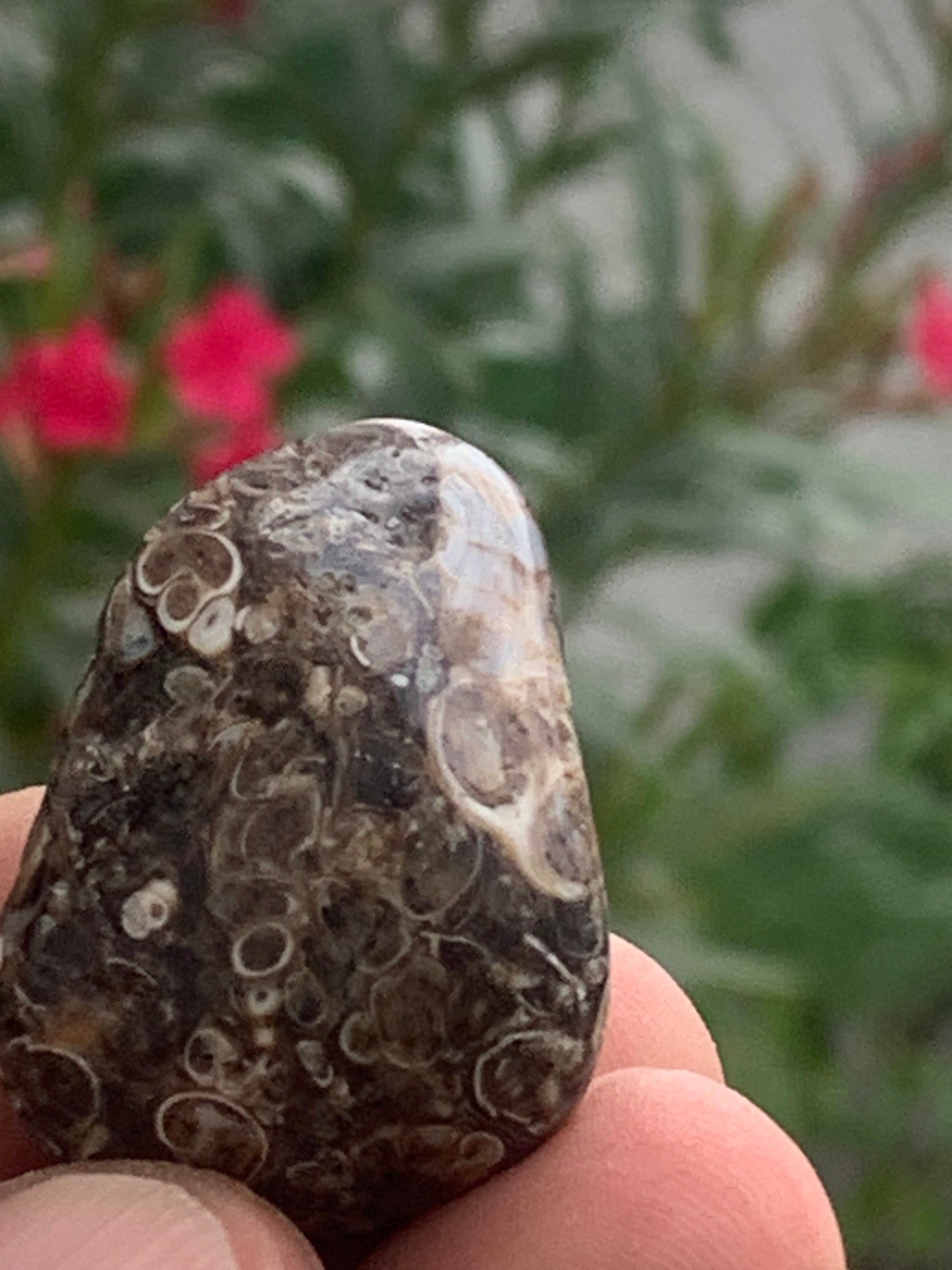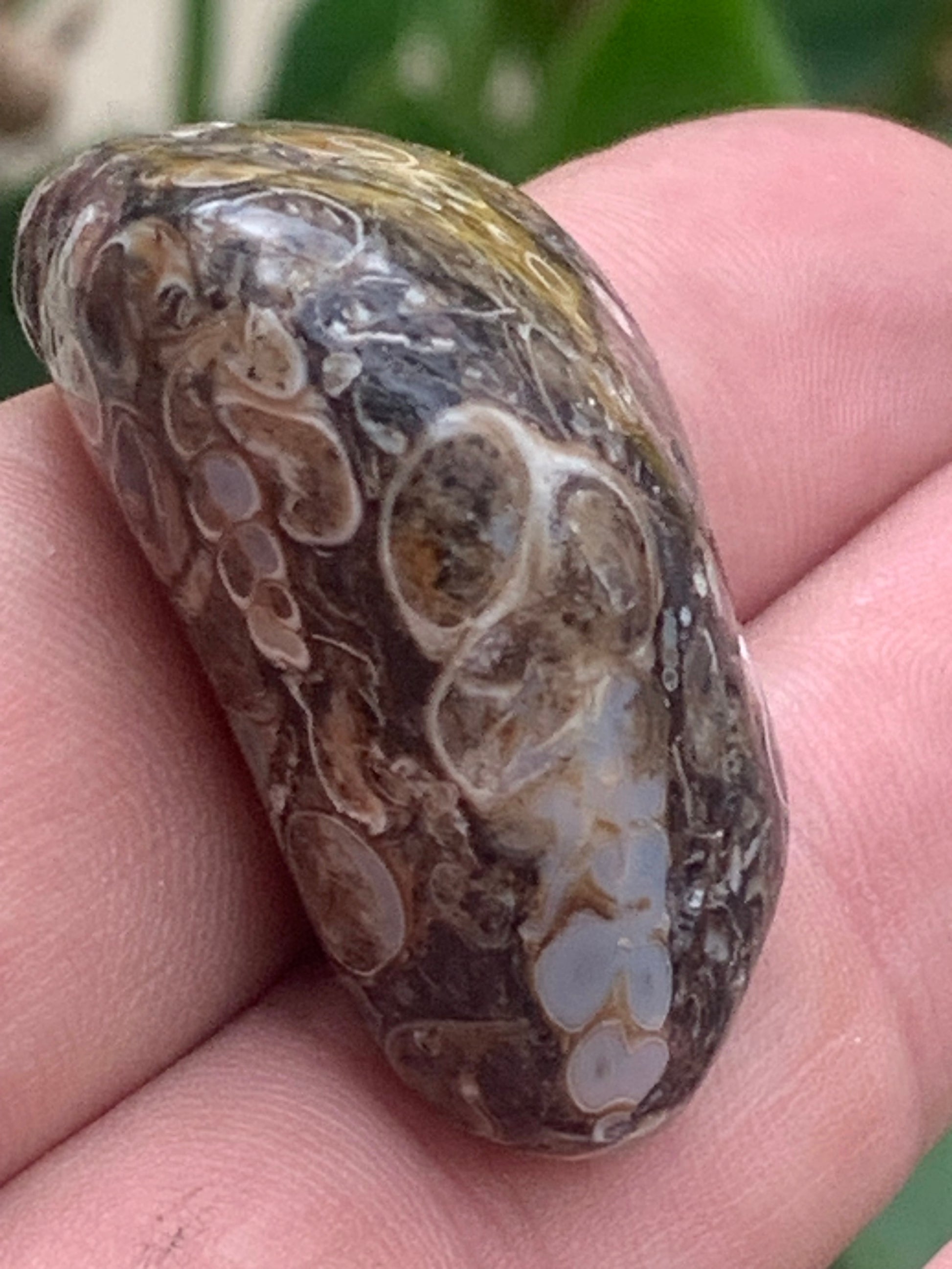 Agate turitelle/ fossile, de 39mm de hauteur x 23 de largeur x 22 d'épaisseur - 20,8 grammes. Magnifique pierre roulée faîte de fossiles !