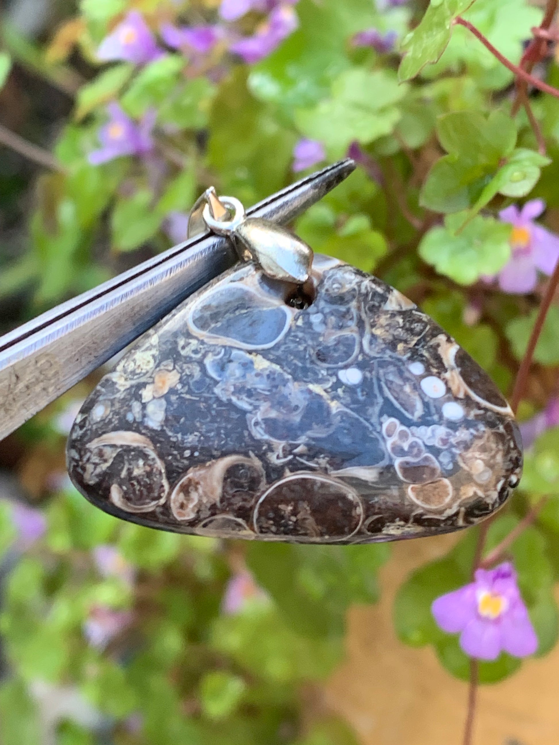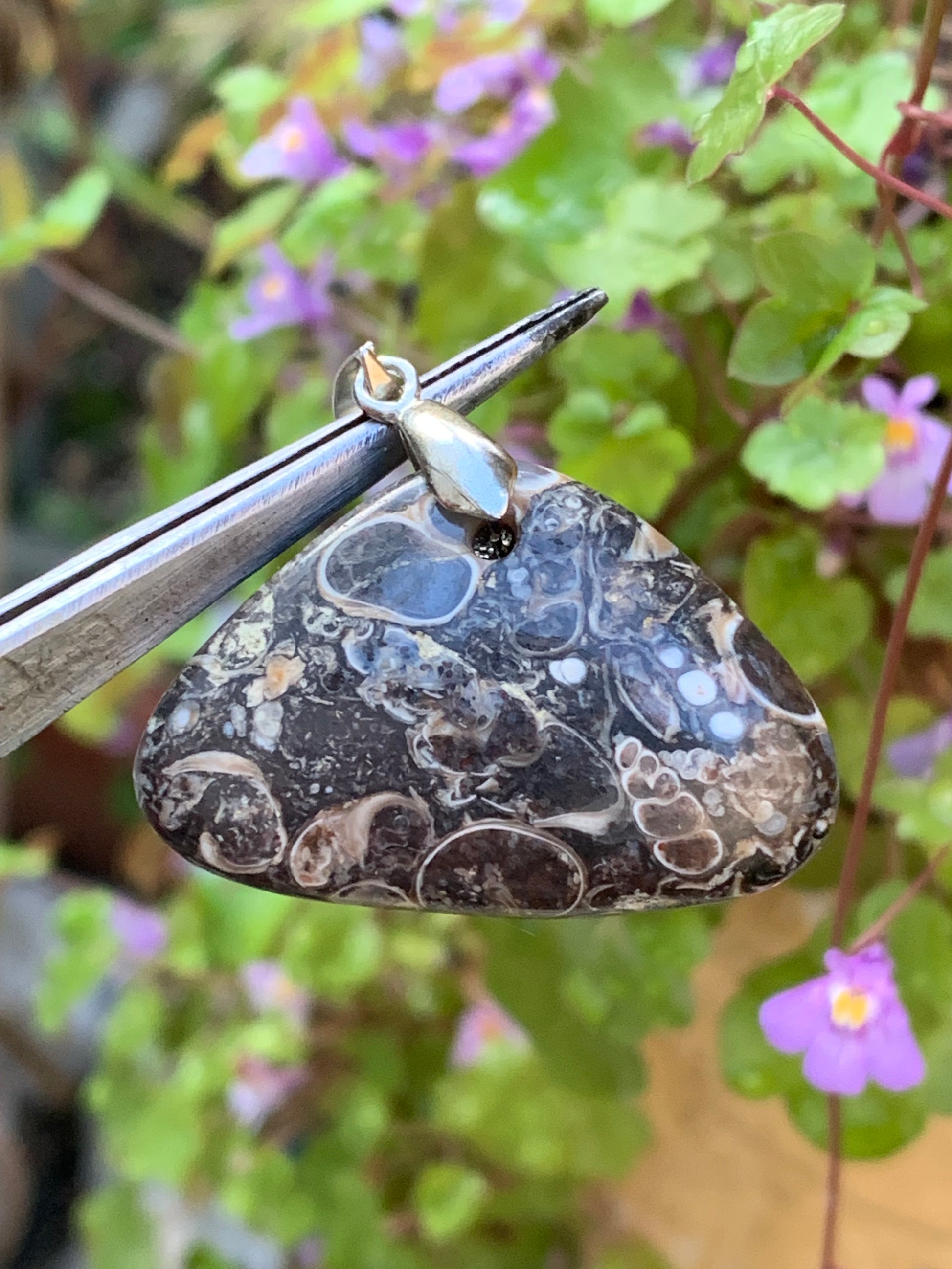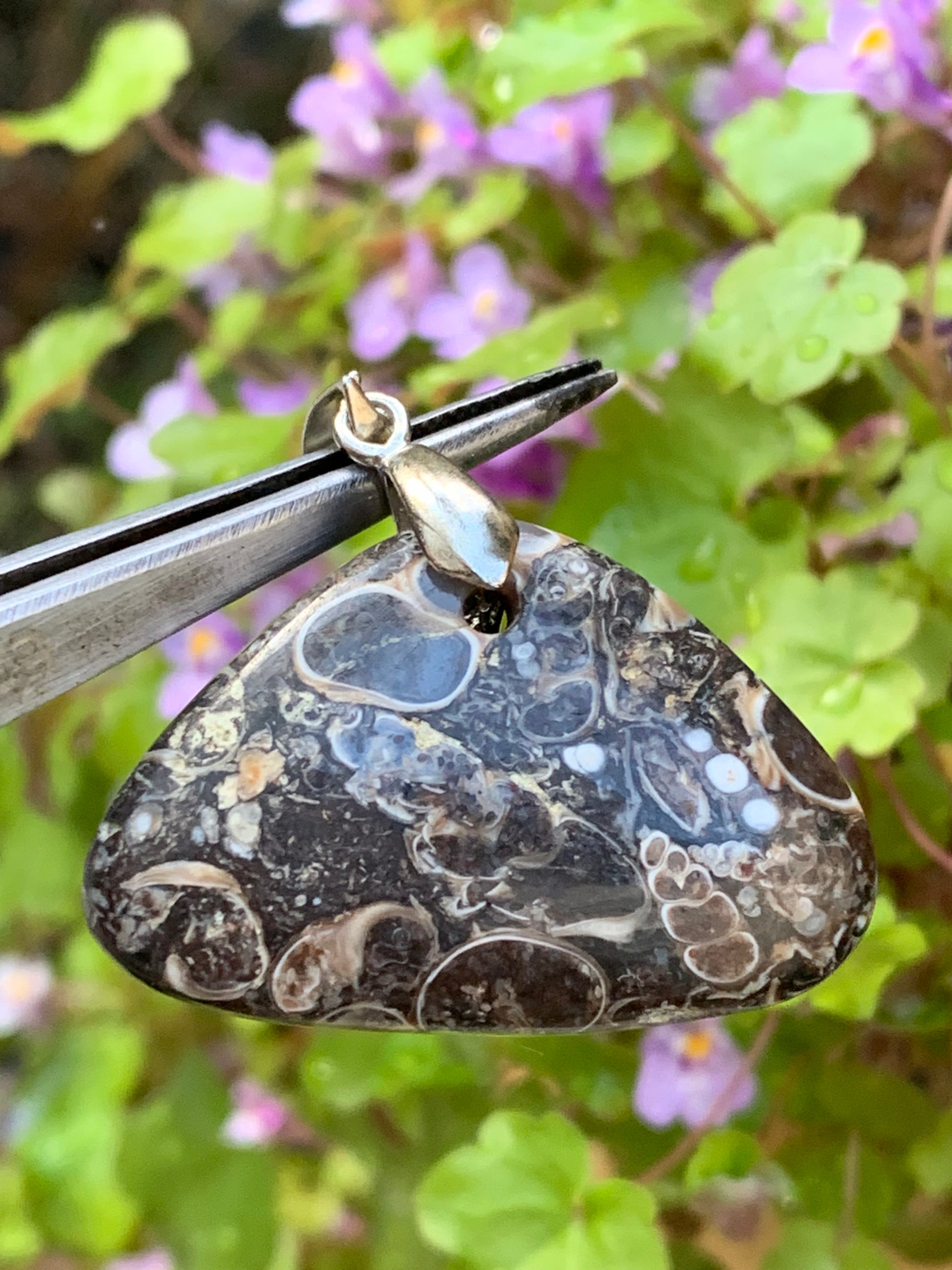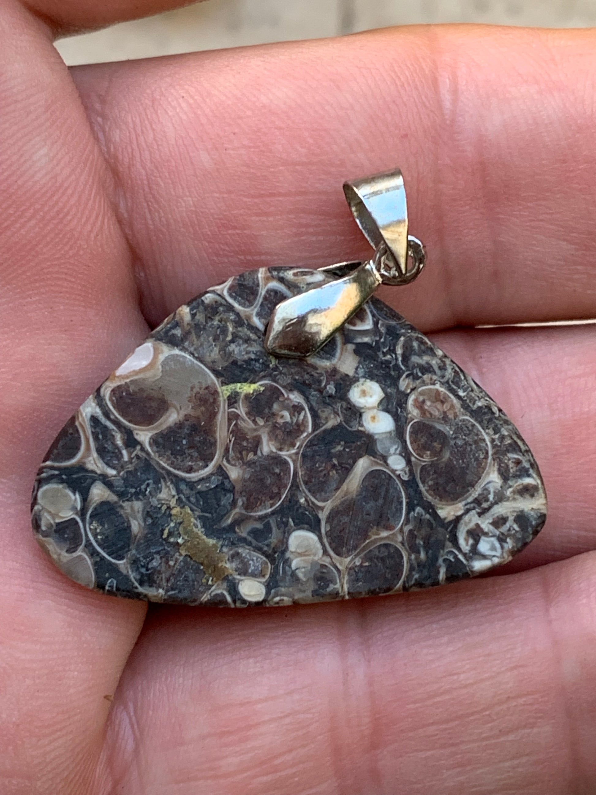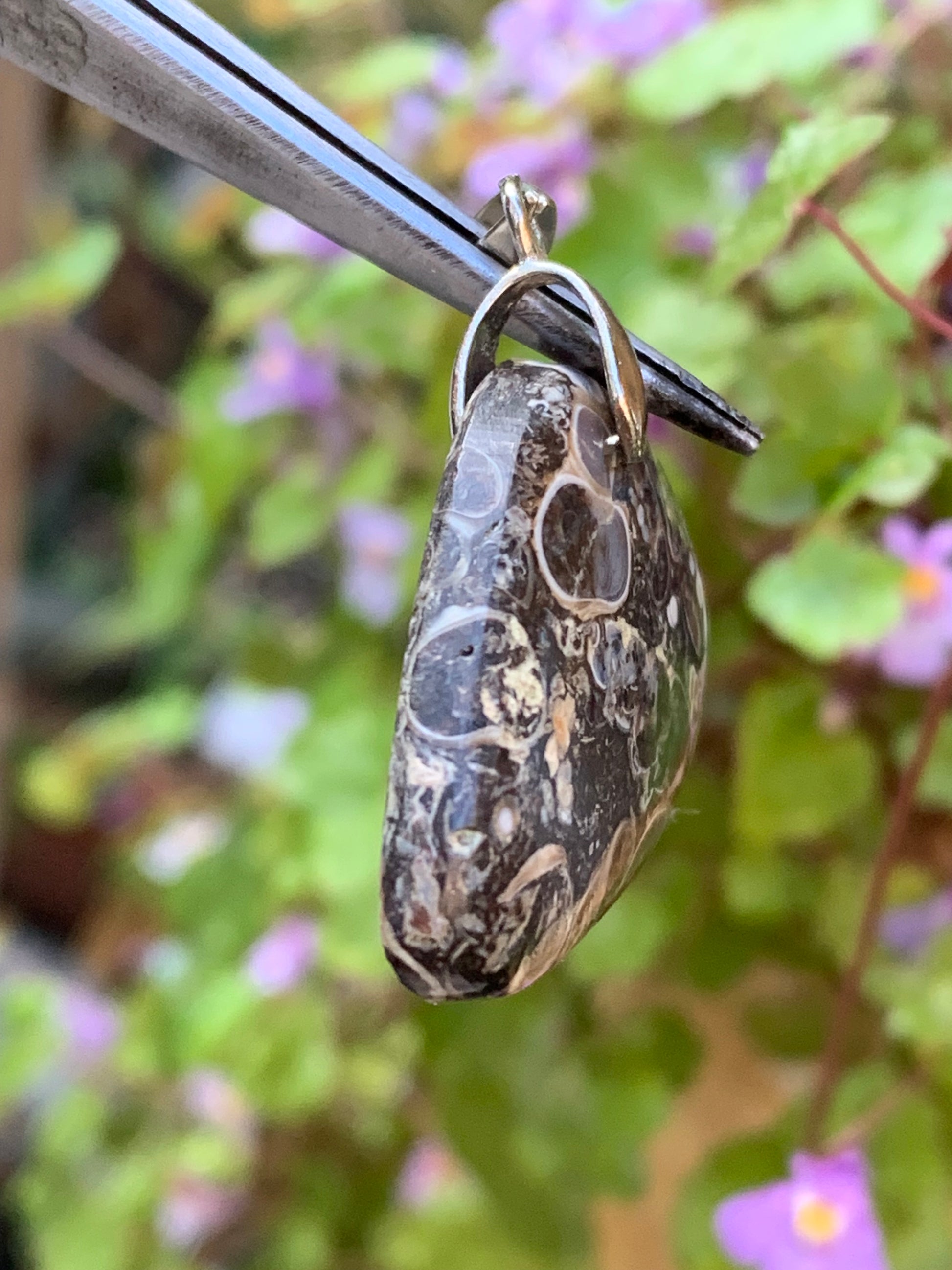 Agate turitelle/ fossile, pendentif de 36mm de hauteur x 36 de largeur x 11 d'épaisseur. Vendu avec cordon réglable de couleur noire !